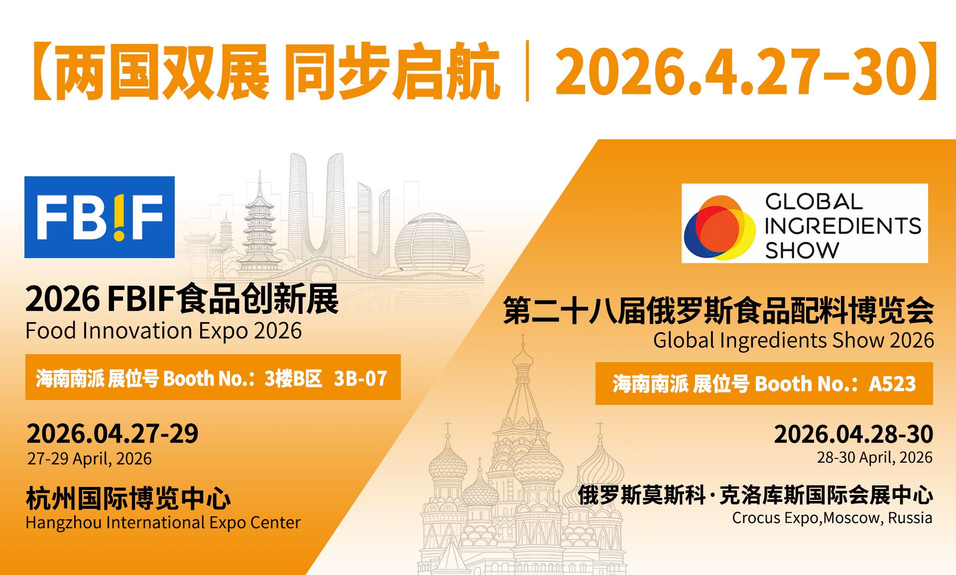 2026年4月27日-30日,【2026FBIF食品创新展】和【第二十八届俄罗斯食品配料博览会】同期开展,海南南派诚邀您参加,期待您的莅临。