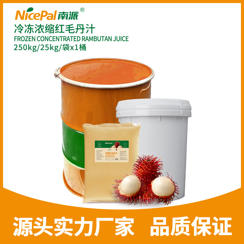 南派冷冻浓缩红毛丹汁采用当季的新鲜红毛丹,在洁净的环境下榨汁,利用独特的生产工艺进行6倍浓缩后,并在-38℃快速急冻后在-18℃下冷冻,有效保留了红毛丹新鲜风味和营养成分。