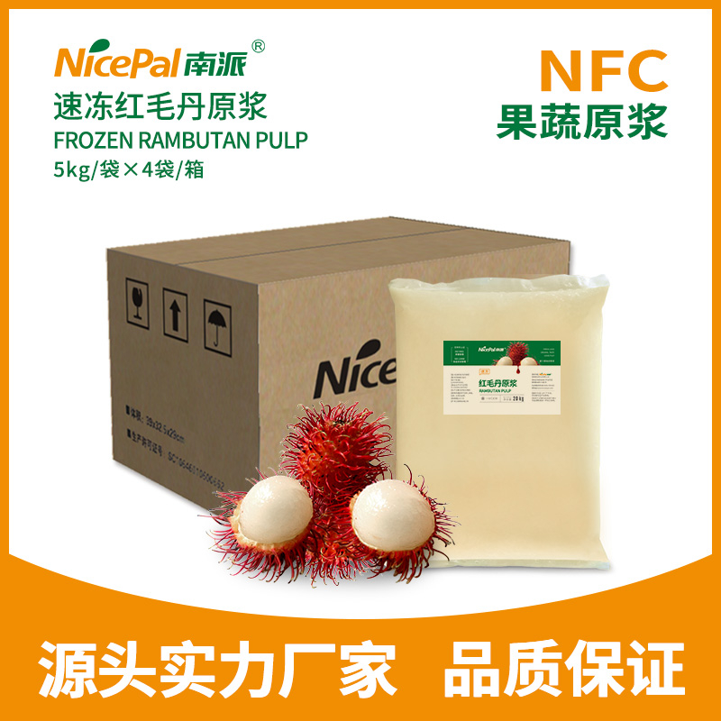 海南南派速冻红毛丹原浆采用当季的新鲜红毛丹,在洁净的环境下榨汁制浆,并在-38℃快速急冻后在-18℃下冷冻,从榨汁到速冻,整个过程在30分钟内完成,有效保留了红毛丹的新鲜风味和营养成分。