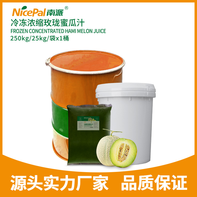 海南南派冷冻浓缩玫珑蜜瓜汁采用当季的新鲜玫珑蜜瓜,在洁净的环境下榨汁,利用独特的生产工艺进行6倍浓缩后,并在-38℃快速急冻后在-18℃下冷冻,有效保留了玫珑蜜瓜新鲜风味和营养成分。